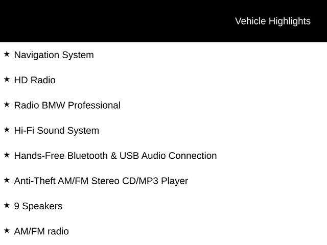- 9 Speakers, AM/FM radio, Anti-Theft AM/FM Stereo CD/MP3 Player, CD player, Hands-Free Bluetooth & USB Audio Connection, HD Radio, Hi-Fi Sound System, Radio BMW Professional, Radio data system
