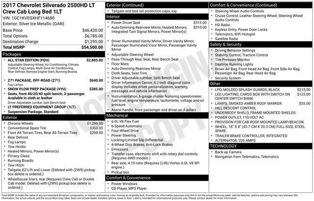 Recent Arrival! 2017 Chevrolet Silverado 2500HD LT 4WD 6-Speed Automatic HD Electronic with Overdrive 6.0L 8-Cylinder SFI Flex Fuel OHV Silver Ice Metallic 110-Volt AC Power Outlet, 4.2" Diagonal Color Display Driver Info Center, 4" Round Chromed Assist Steps (LPO), 6-Speaker Audio System, All Star Edition, Body Color Door Handles, Body-Color Bodyside Moldings, Body-Color Mirror Caps, Body-Color Power-Adjustable Heated Outside Mirrors, Color-Keyed Carpeting Floor Covering, Deep-Tinted Glass, Digital Steering Assist, Driver & Front Passenger Vanity Mirror Visors, Dual-Zone Automatic Climate Control, Electric Rear-Window Defogger, Electronic Shift Transfer Case, EZ-Lift & Lower Tailgate, Front Halogen Fog Lamps, HD Radio, Hill Descent Control, Integrated Trailer Brake Controller, Leather-Wrapped Steering Wheel, Manual Tilt-Wheel/Telescoping Steering Column, Off-Road Z71 Package, OnStar 3 Month Guidance Plan, OnStar 4G LTE Wi-Fi Hotspot, Power Windows w/Driver Express Up & Down, Preferred Equipment Group 1LT, Rear 60/40 Folding Bench Seat (Folds Up), Rear Vision Camera, Rear Wheelhouse Liners, Remote Keyless Entry, Remote Locking Tailgate, Remote Vehicle Starter System, Single Slot CD/MP3 Player, SiriusXM Satellite Radio, Standard Suspension Package, Steering Wheel Audio Controls, Trailering Equipment, Unauthorized Entry Theft-Deterrent System.