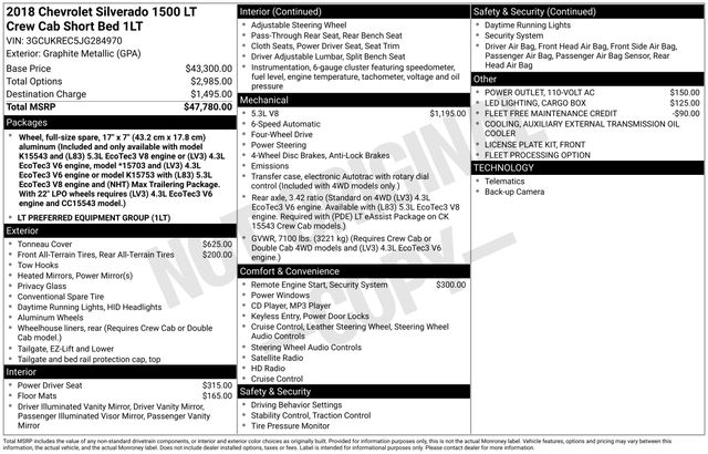 Recent Arrival! 2018 Chevrolet Silverado 1500 LT 4WD 6-Speed Automatic Electronic with Overdrive EcoTec3 5.3L V8 Graphite Metallic 10-Way Power Driver's Seat Adjuster, 110-Volt AC Power Outlet, 150 Amp Alternator, 4-Wheel Disc Brakes, 4.2" Diagonal Color Display Driver Info Center, 40/20/40 Front Split Bench Seat, 6 Speaker Audio System, 6 Speakers, ABS brakes, Air Conditioning, Alloy wheels, AM/FM radio: SiriusXM, Auxiliary External Transmission Oil Cooler, Bluetooth® For Phone, Body Color Bodyside Moldings, Body-Color Door Handles, Body-Color Mirror Caps, Body-Color Power Adjustable Heated Outside Mirrors, Bodyside moldings, Brake assist, CD player, Chevrolet Connected Access, Chevrolet w/4G LTE, Chrome Grille Surround, Cloth Seat Trim, Color-Keyed Carpeting w/Rubberized Vinyl Floor Mats, Compass, Deep-Tinted Glass, Delay-off headlights, Driver & Front Passenger Illuminated Vanity Mirrors, Driver door bin, Driver vanity mirror, Dual front impact airbags, Dual front side impact airbags, Electronic Stability Control, Exterior Parking Camera Rear, EZ Lift & Lower Tailgate, Front & Rear All-Weather Floor Mats, Front anti-roll bar, Front Center Armrest w/Storage, Front Chrome Bumper, Front License Plate Kit, Front reading lights, Front wheel independent suspension, Fully automatic headlights, HD Radio, Heated door mirrors, Heavy-Duty Rear Locking Differential, High-Intensity Discharge Headlights, Illuminated entry, Leather Wrapped Steering Wheel w/Cruise Controls, LED Cargo Box Lighting, Low tire pressure warning, Manual Tilt Wheel Steering Column, Occupant sensing airbag, OnStar & Chevrolet Connected Services Capable, Outside temperature display, Overhead airbag, Overhead console, Panic alarm, Passenger door bin, Passenger vanity mirror, Power door mirrors, Power steering, Power windows, Power Windows w/Driver Express Up, Preferred Equipment Group 1LT, Premium audio system: Chevrolet MyLink, Radio data system, Radio: AM/FM 8" Diagonal Color Touch Screen, Rear 60/40 Folding Bench Seat (Folds Up), Rear Chrome Bumper, Rear reading lights, Rear seat center armrest, Rear step bumper, Rear Wheelhouse Liners, Remote Keyless Entry, Remote keyless entry, Remote Locking Tailgate, Remote Vehicle Starter System, Single Slot CD/MP3 Player, SiriusXM Satellite Radio, Speed control, Speed-sensing steering, Split folding rear seat, Steering Wheel Audio Controls, Steering wheel mounted audio controls, Tachometer, Theft Deterrent System (Unauthorized Entry), Thin Profile LED Fog Lamps, Tilt steering wheel, Traction control, Trailering Package, Tri-Fold Soft Tonneau Cover (LPO), Trip computer, Variably intermittent wipers, Voltmeter.