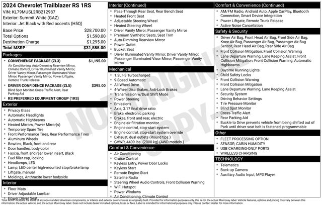 Under the hood, the TrailBlazer RS is powered by a robust 1.3L Ecotec Turbo DOHC SIDI engine with VVT, delivering an impressive 26 city / 29 highway MPG. Paired with a smooth-shifting 9-Speed Automatic transmission and Chevrolet's advanced All-Wheel Drive system, this SUV offers exceptional performance and confidence on the road.