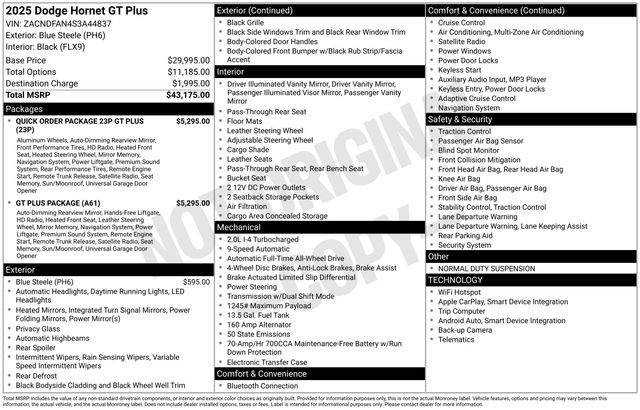 Whether you're commuting, running errands, or embarking on a weekend adventure, the 2025 Dodge Hornet GT Plus is the perfect companion. With its dynamic performance, premium amenities, and sleek styling, this vehicle is sure to exceed your expectations. We invite you to experience the Hornet GT Plus for yourself â" schedule a test drive today and discover the difference.