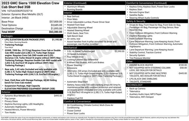 Recent Arrival! 2023 GMC Sierra 1500 Elevation 4WD 10-Speed Automatic 3.0L I6 Dynamic Blue Metallic 120-Volt Bed Mounted Power Outlet, 120-Volt Instrument Panel Power Outlet, 2 Charge/Data USB Ports, 2 Type-C Charge-Only Rear USB Ports, 6-Speaker Audio System Feature, 6" Rectangular Black Tubular Assist Steps (LPO), All-Weather Floor Liner (LPO), Auto-Locking Rear Differential, Black GMC Emblems (LPO), Body Color Header w/Gloss Black Mesh Grille Bars, Cloth Rear Seat w/Storage Package, Color-Keyed Carpeting Floor Covering, Compass, Deep-Tinted Glass, Electric Rear-Window Defogger, Electrical Steering Column Lock, Elevation Black Package (LPO), Front Frame-Mounted Black Recovery Hooks, Front Rubberized-Vinyl Floor Mats, GMC Connected Access Capable, HD Rear Vision Camera, High Capacity Suspension Package, Hitch Guidance, Keyless Open & Start, LED Cargo Area Lighting, Manual Tilt-Wheel & Telescoping Steering Column, Navigation System, OnStar & GMC Connected Services Capable, Power Door Locks, Power Front Windows w/Driver Express Up/Down, Power Front Windows w/Passenger Express Down, Power Rear Windows w/Express Down, Preferred Equipment Group 3SB, Push Button Start, Rear Rubberized-Vinyl Floor Mats, Remote Vehicle Starter System, SiriusXM w/360L, Steering Wheel Audio Controls, Theft Deterrent System (Unauthorized Entry), Trailering Package, Wi-Fi Hotspot Capable, Wireless Phone Projection. 22/27 City/Highway MPG Odometer is 6039 miles below market average!