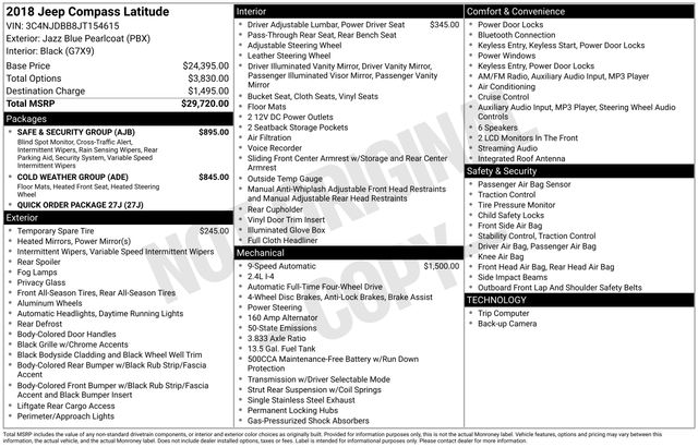 Recent Arrival! 2018 Jeep Compass Latitude 4WD 9-Speed Automatic 2.4L I4 Jazz Blue Pearlcoat 4-Way Power Lumbar Adjust, All-Season Floor Mats, Blind Spot & Cross Path Detection, Brake assist, Cold Weather Group, Compass, Delay-off headlights, Driver door bin, Driver vanity mirror, Electronic Stability Control, Front Bucket Seats, Front fog lights, Front reading lights, Fully automatic headlights, Heated Front Seats, Heated Steering Wheel, Illuminated entry, ParkSense Rear Park Assist System, ParkView Rear Back-Up Camera, Power steering, Power windows, Quick Order Package 27J, Rain Sensitive/Intermittent Wipers, Remote keyless entry, Reversible Carpet/Vinyl Cargo Mat, Safe & Security Group, Security Alarm, Steering wheel mounted audio controls, Windshield Wiper De-Icer. 22/30 City/Highway MPG Odometer is 15530 miles below market average!