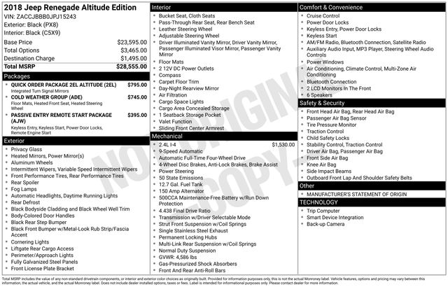 Discover the perfect blend of capability and style with this 2018 Jeep Renegade Altitude. Boasting a robust 2.4L I4 engine paired with a smooth-shifting 9-Speed 948TE Automatic transmission, this Renegade delivers impressive 4WD performance and efficiency, with an EPA-estimated 21 city and 29 highway MPG.