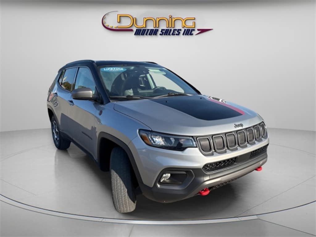 Recent Arrival! 2022 Jeep Compass Trailhawk 4WD 9-Speed 948TE Automatic 2.4L I4 Billet Silver Metallic Clearcoat 10.1" Touchscreen Display, 115V Auxiliary Power Outlet, 2nd Row USB Type A/C Charge Only, 4-Wheel Disc Brakes, 4.334 Axle Ratio, 6 Speakers, ABS brakes, Air Conditioning, Alloy wheels, AM/FM radio: SiriusXM, Anti-whiplash front head restraints, Auto High-beam Headlights, Auto-dimming Rear-View mirror, Automatic temperature control, Brake assist, Bumpers: body-color, Compass, Delay-off headlights, Disassociated Touchscreen Display, Driver door bin, Driver vanity mirror, Dual front impact airbags, Dual front side impact airbags, Electronic Stability Control, Emergency communication system: SiriusXM Guardian, Four wheel independent suspension, Front anti-roll bar, Front Bucket Seats, Front Center Armrest w/Storage, Front dual zone A/C, Front fog lights, Front reading lights, Fully automatic headlights, Global Telematics Box Module (TBM), Heated door mirrors, Heated Front Seats, Illuminated entry, Knee airbag, Leather Shift Knob, Leather Wrapped Steering Wheel, Low tire pressure warning, Occupant sensing airbag, Outside temperature display, Overhead airbag, Overhead console, Panic alarm, ParkView Rear Back-Up Camera, Passenger door bin, Passenger vanity mirror, Power 2-Way Driver Lumbar Adjust, Power Adjust 8-Way Driver Seat, Power door mirrors, Power steering, Power windows, Premium Cloth/Leather Trim Bucket Seats, Quick Order Package 2GE, Radio: Uconnect 5 w/10.1" Display, Rain sensing wipers, Rear anti-roll bar, Rear seat center armrest, Rear window defroster, Rear window wiper, Remote keyless entry, Remote Start System, Reversible Carpet/Vinyl Cargo Mat, Roof rack: rails only, Security system, Speed control, Split folding rear seat, Spoiler, Steering wheel mounted audio controls, Tachometer, Telescoping steering wheel, Tilt steering wheel, Traction control, Trailhawk Convenience Group, Trip computer, Turn signal indicator mirrors, Variably intermittent wipers, Vehicle Information Center, Wheels: 17" x 6.5" Painted Diamond Cut Aluminum, Windshield Wiper De-Icer. 22/30 City/Highway MPG
