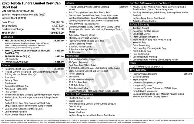 Recent Arrival! 2025 Toyota Tundra Limited 4WD 10-Speed Automatic 3.4L V6 Magnetic Gray Metallic 120V Deck & Cabin Power Supply, Auto-dimming door mirrors, Bumpers: body-color, High Grade Full LED Headlamp, Multi-Terrain Back Monitor, Panic alarm, Power Package, Power Tilt/Slide Panoramic Sunroof, Premium Package, Rear Camera, Safety Connect, Security system, Speed control, Tow Tech Package w/Wireless Trailer Camera, Towing Package, TRD Off-Road Package, Wheels: 20" TRD Alloy, Wireless Charger.